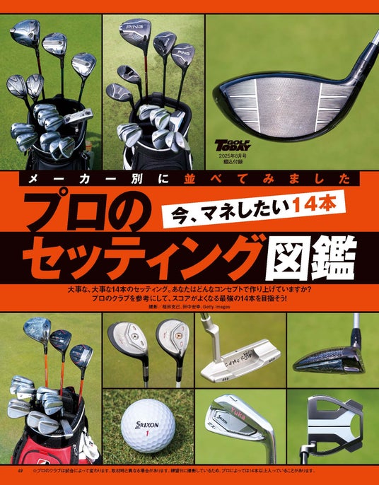 綴じ込み付録その1は「プロのセッティング図鑑」。気になる プロのクラブセッティング 。どんなモデルでどう組み合わせて14本を作り上げているのか? 海外、国内、男女問わず、今回は初めてメーカー別にプロのクラブを並べてみました。あなたはどのプロをマネしてみますか?