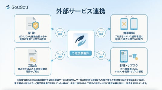 このたび出資を決定した「SouSou」は、法的根拠のある電子署名や、データの安全な保管・開示、そして逝去判定のデジタル化などのテクノロジーの力により、安心・確実にその人の想いを未来に届けるための基盤となるプラットフォームです。中でも、マイナンバーカード(公的個人認証事業者の現況確認サービス)を活用することで遺族等の届出に依存せず故人の逝去を検知することが可能な「デジタル逝去判定」は、保険・金融・葬儀業界に加え、生活インフラへの応用も可能です。故人の意思とデジタル遺品の一元管理が実現できれば、将来的に重要な社会インフラとなる可能性があると判断し、出資・事業連携に至りました。