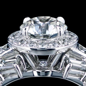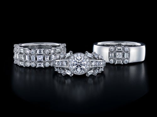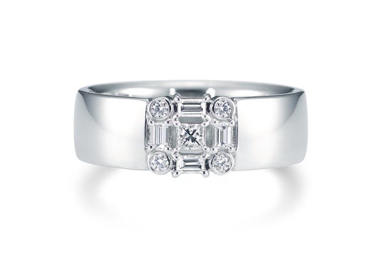 中心部分に配されたラウンドカット・バゲットカット・プリンセスカットのメレダイヤモンドの彩りが気品ある指元を演出。幅にボリュームがありながらも、内甲丸の丸みをしっかりと創っているため滑らかな着け心地を感じられます。ダイヤモンドの輝きと地金特有の美しさが相まって荘厳な存在感に。
