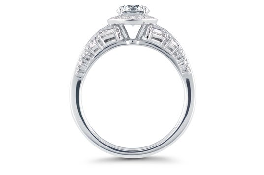センターダイヤモンドをより一層輝かせるためにメレダイヤモンドを石座の下に留めたリフレクティブセッティングを採用。またセンターダイヤモンドが輝くための光をとり込めるようにサイドの空間の大きさまでも計算されたデザイン。