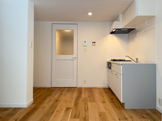 専有部は、グッドルームのオリジナルリノベーションブランド「TOMOS(トモス)」でシンプルでナチュラルな内装に仕上げました。元社員寮の3点ユニット式の単身間取りから、近年の賃貸トレンドをふまえ、3点ユニットバスを解体&洗面所を新設。キッチンは「壁付」や「カウンター」など、goodroomでも人気のトレンドを押さえた仕様にリノベーションを行いました。