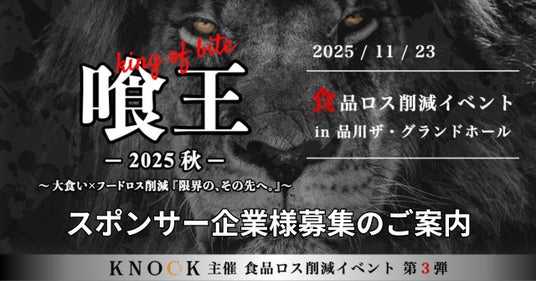 株式会社KNOCK(本社:東京都新宿区、代表取締役:加藤 芳郎)は、2025年11月23日(日・祝)に品川ザ・グランドホールにて、国内最大級の大食いイベント「喰王 -king of bite- 2025秋」を開催いたします。本イベントの趣旨にご賛同いただけるスポンサー企業様を広く募集いたします。