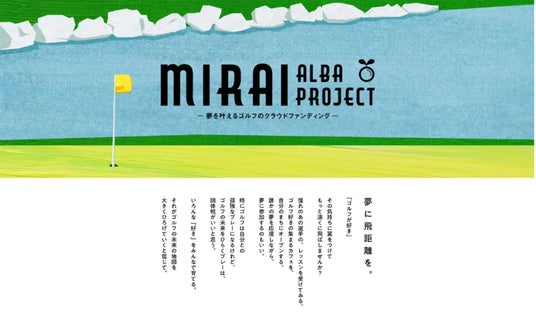 「MIRAI ALBA PROJECT」は、次世代のゴルフアイテムやサービスを発掘・応援するクラウドファンディングプロジェクトです。日本最大級のクラウドファンディングプラットフォーム「CAMPFIRE」と、ゴルフメディア「ALBA」が連携し、ゴルフ市場に新たな価値を生み出すためにスタートしました。