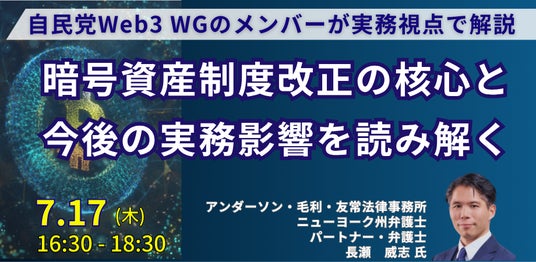本セミナーでは、多数のブロックチェーン関連案件を取り扱い、自民党Web3 WGのメンバーとして制度改正の議論に携わった経験に基づき、これらの重要な法改正の要点を解説するとともに、web3事業に及ぼす影響について詳説いたします。