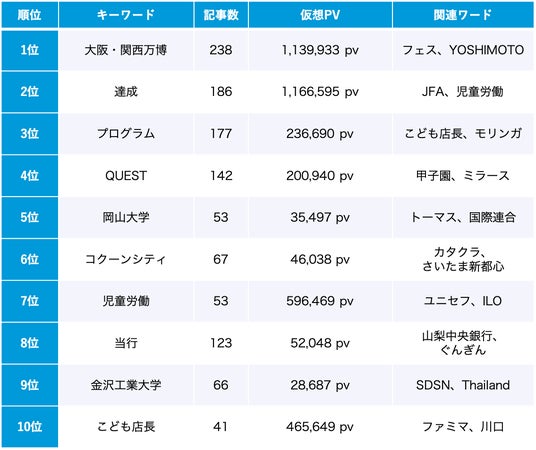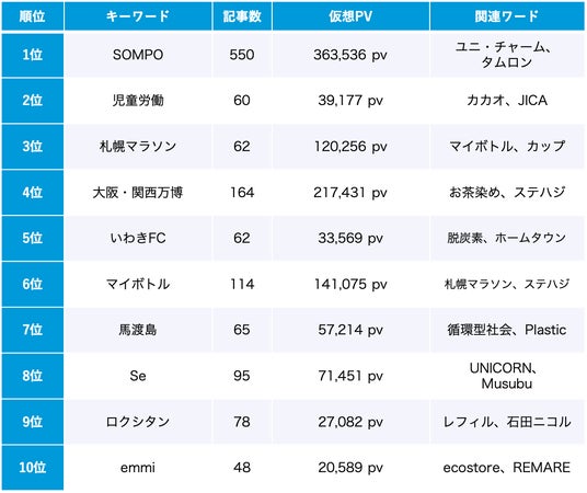 10位はファミリーマートの新プログラム「ファミマこども店長+SDGs」の話題。従来の就業体験プログラムにサステナビリティ体験を融合させ、こどもたちと保護者が持続可能な社会への理解を深め地域交流を活性化できるようにする取り組みです。