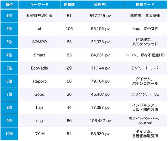 1位の「SOMPO」は、SOMPOアセットマネジメント株式会社の「SOMPOサステナブル運用」に用いられる「SOMPOサステナビリティ・インデックス」の構成銘柄の話題です。収集されたのは選定された企業によるプレスリリースが大半ですが、総合ニュースサイトでコスモエネルギーホールディングス、ゴム業界紙で住友理工、物流業界サイトでNIPPON EXPRESSホールディングスなどの選定が取り上げられています。