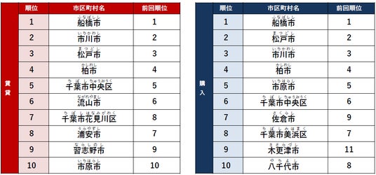 購入1位は「茂原」駅で、前回4位からランクアップしました。駅周辺にはショッピングモールの「南総サンヴェルプラザ」や「三越」などがあり、買い物をするのに便利です。また、茂原公園内には2,000本以上の桜が植えられていて、「さくら名所100選の地」に選ばれました。