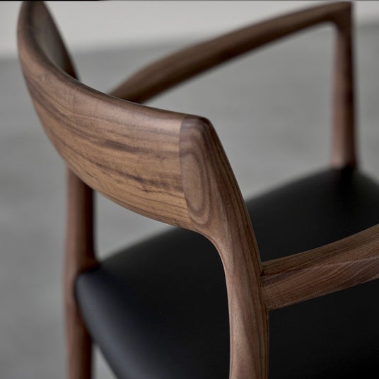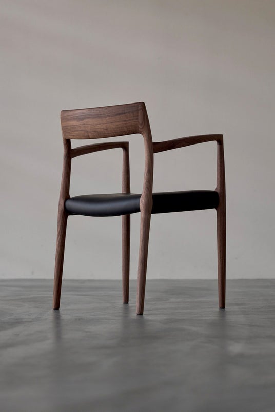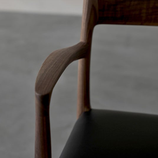研ぎ澄まされたシンプルさで、優雅なシルエットが映える「Model57」繊細かつ美しいフレームが特徴のアームチェア「Model 57」。アメリカ産の高品質なウォールナットを使用し、無垢材の自然な木目や質感を活かしています。なかでもアームは、腕を置く位置や手を掛ける位置に合わせて形が変わり、有機的な曲線を描くことで、椅子全体が美術工芸品のような美しさを放っています。