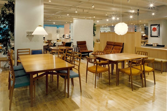 左写真は1985年にオープンした、インテリアギャラリー・アクタス(現アクタス・新宿店)の店内風景です。J.L.MØLLERのチェアも多数展示し、大きな注目を集めました。