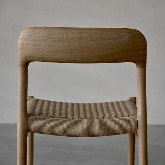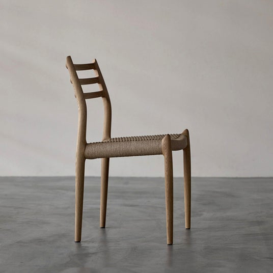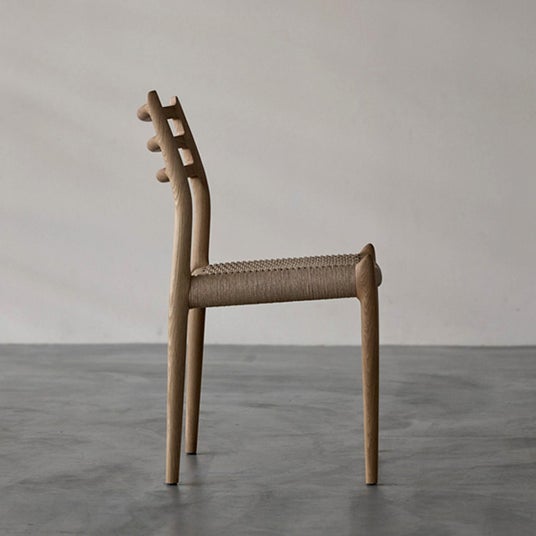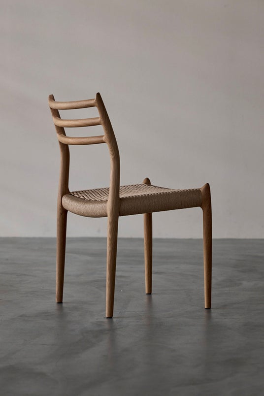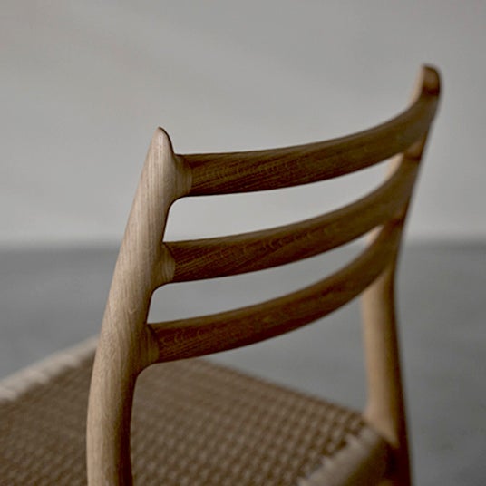 優美なフォルムで、62年間愛され続ける「Model 78」Model 78は、J.L.MØLLERの創業者であり家具職人、そして家具デザイナーでもあるニールス・O・モラーが、1962年にデザインしたダイニングチェアです。継ぎ目のない流れるような一本の後脚、上品なカーブを描いた背もたれの横桟(よこざん)、象徴的な角のある前脚など絶妙なデザインで、時代を超えて愛されています。