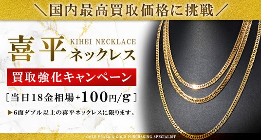 株式会社マーキュリー(本社:東京都新宿区西新宿1-26-2新宿野村ビル23階、取締役社長:秋間 剛)のグループ会社で、貴金属をはじめブランド品やダイヤモンド・ジュエリーの買取、販売を行う株式会社Clarisse (本社:東京都新宿区西新宿8-11-1日東星野ビル6階、取締役社長:川崎 拓)が展開するゴールドプラザでは貴金属・ブランド品・ 宝石を業界最高水準の安心買取りで累計61万人のお客様にご利用いただいております。店舗での買取をはじめLINE査定、宅配買取など、各種お客様に合わせたお買取り方法にも対応しており、また情勢の動きなども敏感に察知し情報を発信しております。今回は、ご好評頂いております喜平ネックレス高価買取キャンペーンのお知らせ致します。