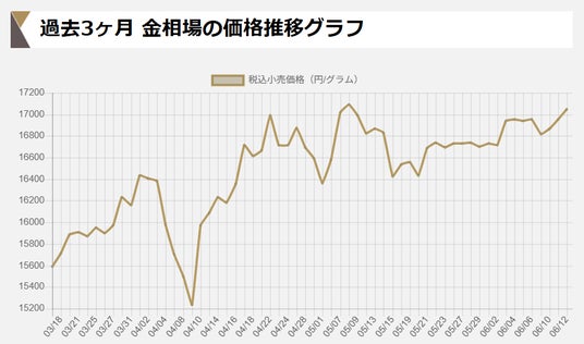 今年の1月よりトランプ政権がスタートし、関税政策をきっかけに世界の市場や情勢は大きく揺れ動いております。安定資産として名高い金も過去3ヶ月にわたっておよそ2,000円以上も値上がり。5月はやや横ばい状態だったものの、今月に入りトランプ政権による鋼鉄やアルミニウムの追加関税、米中関係の輸出問題、緊迫化する中東情勢などが金の需要を高め、再び1gあたり17,000円を突破しました。止まらぬ勢いをみせている金相場は夏以降にどこまで相場を伸ばしてくるのでしょうか。そこで今回は、天井の知らぬまさに怒涛の如く突き進む金相場にあやかりまして、以前よりご好評頂いておりました喜平ネックレスの強化買取キャンペーンを開催します!