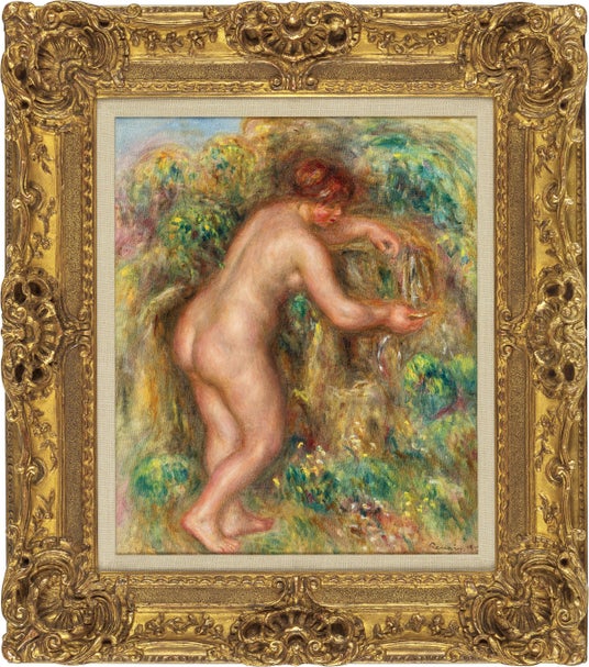 ピエール=オーギュスト・ルノワールの晩年の傑作「泉をくむ裸婦」は、画家が長い画業の果てに到達した《絵画による生命賛歌》の極致と呼べる名品です。陽光に輝く草叢と湧水の瑞々しい描写は、湿潤な空気や若草の香りまで感じさせるかのようで、裸婦の肌は温もりと生命力に満ちています。本作は、日本の洋画界に影響を与えた「泉による女」(大原美術館蔵)と主題・構図が近似しており、私たちの想起する《ルノワールの名品》の典型といえましょう。磁器絵付けの修行から始まった彼の画業は、前衛的な印象派の色彩表現と古典絵画の造形美を融合させ、晩年には裸婦という伝統的主題に収斂しました。曲線を多用した柔らかな筆致と、光を放つような色彩が画面全体に躍動感を与え、描かれたモチーフの全てに生命の力強さが謳われるかのようです。ルノワールの孤高の画境を表す本作は、次代の芸術家たちを奮い立たせた彼の芸術の精髄を堪能できる逸品です。