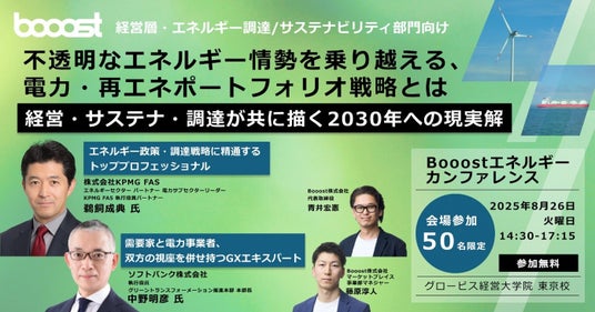 Booost 株式会社(本社:東京都品川区、代表取締役:青井宏憲)は、企業のエネルギー調達戦略を展望する無料カンファレンス「不透明なエネルギー情勢を乗り越える、電力・再エネポートフォリオ戦略とは」を、2025 年 8 月26 日(火)に、グロービス経営大学院 東京校にて開催いたします。