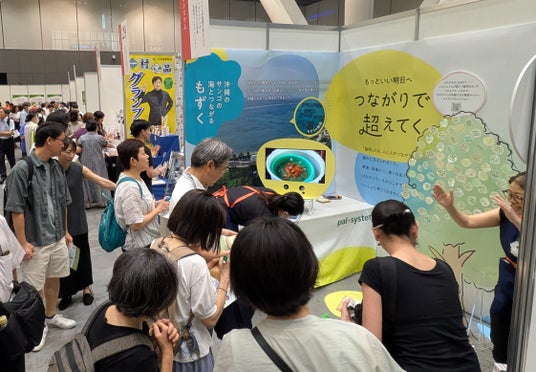 パルシステムブースでは、これまでの活動から生まれた商品や活動の一例を紹介しました。沖縄県の恩納村漁協との協同により開発した「産直もずくのスープ」を配付しながら、商品の売り上げの一部で白化してしまったサンゴの植樹活動をしていることを伝えました。また、山梨県の南都留森林組合と開発した間伐材のプレートを台にしてメッセージ記入を呼びかけ、森林産直によるつながりも紹介しました。