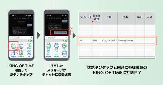LINE WORKSは導入社数が46万社以上、利用者数500万人を誇る国内シェアNo.1※1のビジネスチャットです。しかし、業務ツールやSaaSが多様化する中で、ユーザーは必要なアプリやブラウザの切り替え作業に追われ、ツールの分散が社内浸透や業務効率の課題となっていました。本サービスは多くのビジネスユーザーが利用しているLINE WORKSをツールの「入口」として集約することにより、従業員のUI統一と各ツールの管理負荷軽減を図ってきました。今回連携する「KING OF TIME」は、導入企業数6.2万社、利用者数390万人を誇る勤怠管理システム分野で国内シェアNo.1※2のサービスです。打刻業務はほぼ全てのビジネスパーソンが日々行う作業であり、利用頻度の高いKING OF TIMEをLINE WORKSに集約することで、多くのユーザーの業務効率向上が見込まれます。今後も他業務ツール・SaaSとの連携を積極的に進め、より多様なワークフローの最適化を目指します。■KING OF TIME連携の利用方法