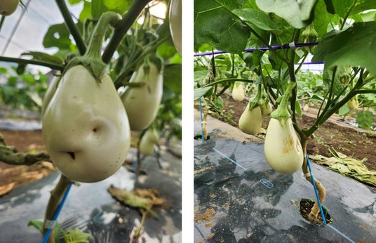 ■料亭などにも卸される、きめ細かい果肉で上品な味わいの白なす 急激な猛暑のため規格外品が多く発生
