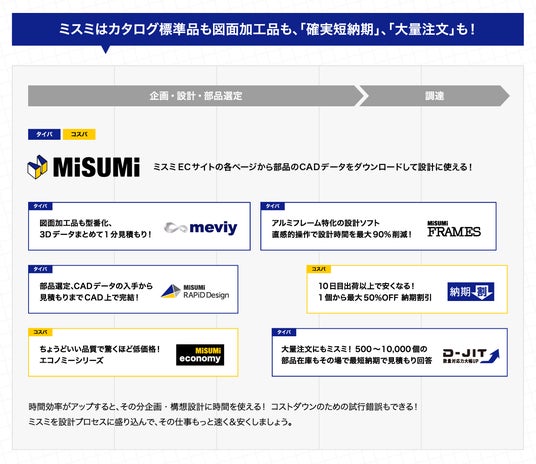 今回のキャンペーンを機に、カタログ標準品から図面加工品まで、デジタルサービスによる業務効率化と、大量注文によるコスト削減、さらにミスミの「確実短納期」が実現する、高いコスパ、タイパをぜひご体感ください。