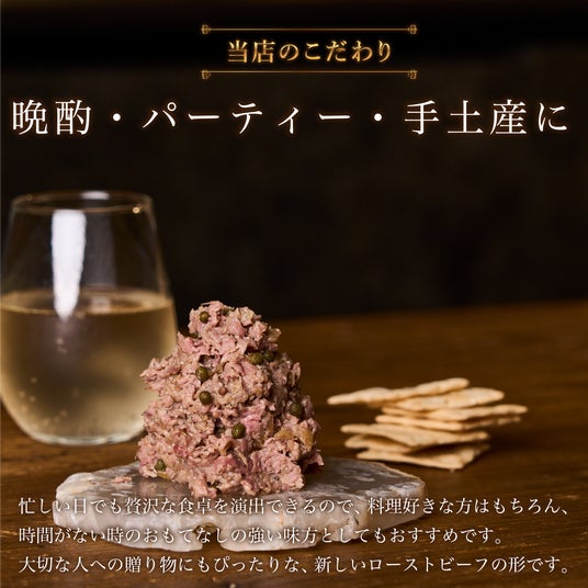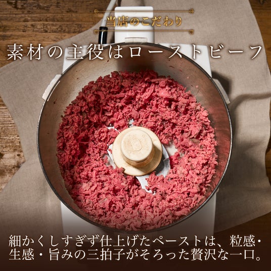 「ローストビーフ=切って食べる」という常識を覆したい。手動で粗みじんにした肉に、丁寧に炒めた野菜と塩麹を加え、“なめらかで、しっかり肉を感じるペースト”に仕上げました。