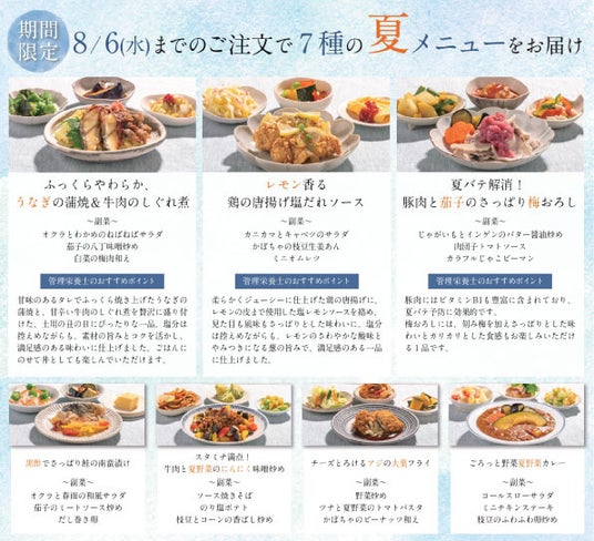 全メニュー:ふっくらやわらか、うなぎの蒲焼き&牛肉のしぐれ煮、ごろっと夏野菜カレー、スタミナ満点!牛肉と夏野菜のにんにく味噌炒め、夏バテ解消!豚肉と茄子のさっぱり梅おろし、レモン香る 鶏の唐揚げ塩だれソース、黒酢でさっぱり鮭の南蛮漬け、チーズとろけるあじの大葉フライ