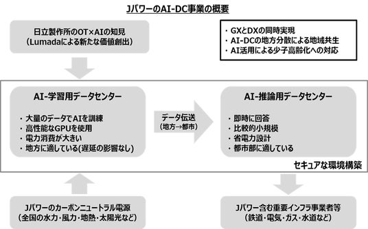 Jパワーが有するカーボンニュートラル電源(水力・風力・地熱・太陽光など)と、日立が有するDCのIT設備・運営ノウハウ、さらにLumada*2をはじめとしたAIの豊富なユースケースなどの強みを掛け合わせることで、重要社会インフラ事業におけるAI-DCの検討を進めていきます。