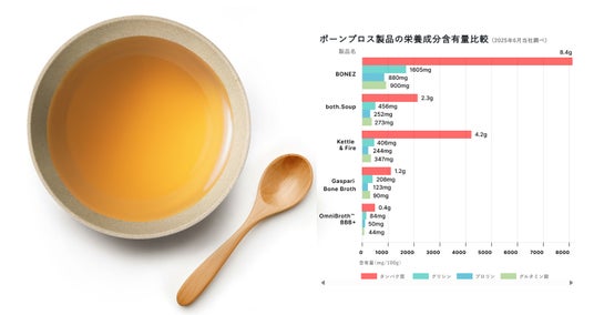 さらに、『BONEZ』では従来のボーンブロスにありがちな濁りや臭みを解消するため、17世紀のフランス宮廷料理で生まれた、スープを澄ませる伝統技法「クラリフィエ」を採用。雑味や濁りを丁寧に取り除くことで、美しい琥珀色の、香り高く洗練された味わいに仕上げました。