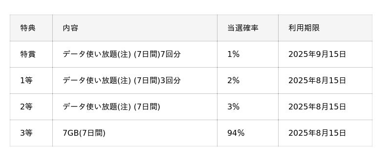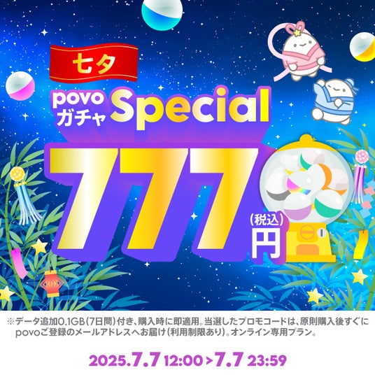 KDDI、沖縄セルラーは2025年7月7日正午から午後11時59分までの12時間、povo2.0の期間限定トッピングとして、最大でデータ使い放題(注)(7日間)7回分が抽選で当たる7づくしの「povoガチャ スペシャル~七夕~」を777円で提供します。