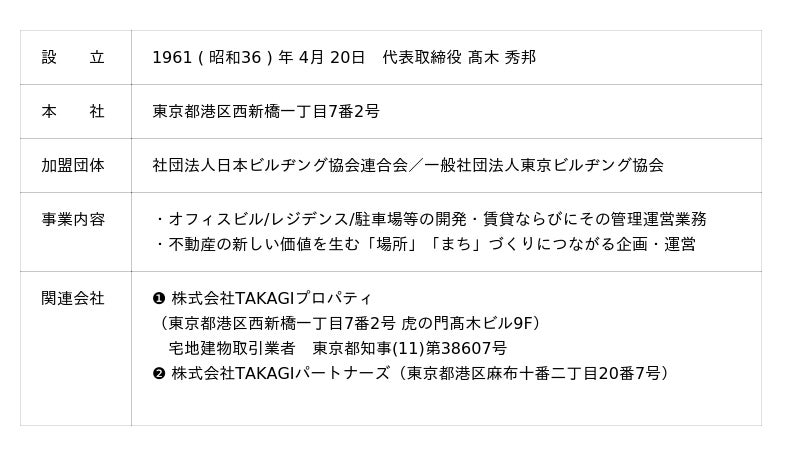 1961(昭和36)年に創業。スタートは、駐車場・貸家管理会社で、第一号の旧虎の門高木ビルを皮切りに、オフィスビル建設・管理を手がけてきました。戦後の高度成長期、昭和のバブル期を経て、平成、令和と激変する時代とともに、不動産への価値観も変化しています。ビルオーナーとして、どう応えていくのか。賃料で稼ぐ不動産業界において、古くからの慣習や固定概念にとらわれるのではなく、「不動産の新たな価値を」追求する中で、私たちが大切にしたいと考えるのが「人」です。オフィスビルなど「場」に集まる人たちのチャレンジや、より良い人生に伴走することが、私たちの使命だと考えています。「For ”Stand by me.”」をフィロソフィーに掲げ、オフィスビル事業を「LIVE事業」、コワーキングオフィスを主軸にしたコミュニティプロジェクトを「BIRTH事業」を展開し、人々のライフスタイルに寄り添い、不動産の新たな価値づくりを推進しています。また、BIRTH事業においては、人とコミュニティを起点に、地方活性化を目的とした官民連携事業にも積極的に取り組んでいます。