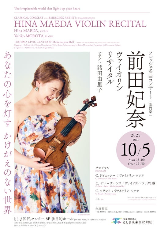 伸びやかで繊細な音色と圧倒的な表現力に定評がある前田妃奈がフランス系ヴァイオリン・ソナタの最高傑作として知られるフランクの作品など、珠玉の音楽を奏でます。心を灯す、美しき音色、彼女がつむぎだすかけがえのない音世界をこの機会にぜひお楽しみください。