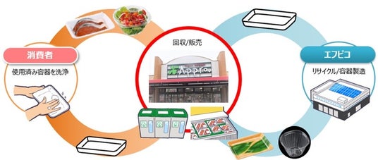 株式会社エフピコ(代表取締役会長:佐藤 守正、以下「エフピコ」)と食品館アプロを運営する株式会社カノー(代表取締役社長:嘉納 英蔵、以下「カノー」)は協働し、大阪府48店舗、兵庫県4店舗、京都府1店舗、計53店舗(2025年6月時点)を対象に、店頭で回収された使用済み食品トレーを新たな食品トレーに生まれ変わらせる「トレー to トレー」を行い、再び店頭で積極的に「エコトレー」等のエコ製品(※1)を使用する「ストア to ストア」、水平リサイクル(※2)の協働を強化いたします。