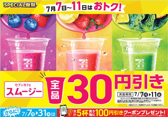 株式会社セブン‐イレブン・ジャパン(本社:東京都千代田区、代表取締役社長:阿久津 知洋)は、7月7日(月)から11日(金)の期間限定で、野菜やフルーツを簡単&気軽に摂取できる「セブンカフェ スムージー」を全品30円引きにて販売いたします。また、7月7日(月)から31日(木)の期間限定で、セブン‐イレブンアプリを提示して「セブンカフェ スムージー」を5杯購入ごとに、「セブンカフェ スムージー」いずれか1杯が100円引きになるクーポンをプレゼントします。