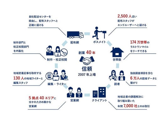 当社は、地域密着型の生活情報誌『ちいき新聞』の発行を軸に、情報発信および販売促進の総合支援事業を展開しており、年間約7,000社にサービスを提供しています。千葉県を中心に毎週発行している『ちいき新聞』は、専属の配布員により174万世帯へポスティングされ、創業以来40年以上にわたり配布を継続してきたことで、他に類を見ない9つのアセットを築いてきました。