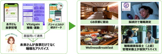 より詳細な睡眠アドバイスを希望する方には、グリーンハウスグループが運営する「ホテルグランバッハ京都セレクト」において、睡眠に最適な環境を整えた専用ルームで睡眠時の脳波を測定し、その結果に基づいて当社の管理栄養士・上級睡眠健康指導士から一人ひとりに合わせた睡眠アドバイスを提供。『あすけん』に連携したPHRだけでなく、日常生活をヒアリングしたうえで睡眠アドバイスを行うため、一層パーソナライズされたアドバイスによる睡眠課題への気づきや行動改善の促進が期待されます。