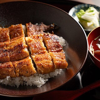 メニューは、鰻丼をはじめ一品料理など約25種類をご用意。定番の「鰻丼 特選」(6,900円)は、腹開きにして頭をつけたまま蒸さずにタレをつけ、備長炭の高火力で焼き上げます。うなぎを背開きにして蒸す工程が入る関東風とは異なり、中はふわっと皮面はパリッと香ばしい味わいに仕上がる“関西地焼き”ならではのおいしさをご堪能ください。「鰻丼」のほか「ひつまぶし」もそろえ、羽釜で炊いたアツアツのお米と一緒にお召し上がりいただきます。