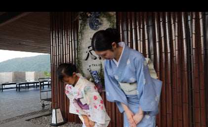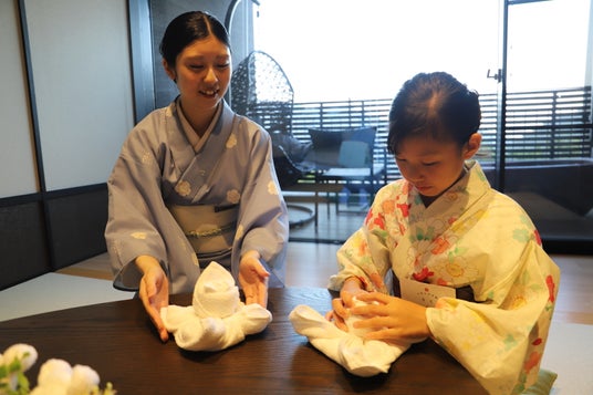 お子さまと一緒に楽しめるキッズプログラムを開催。「自然と和のおもてなし」を象徴する女将のお仕事を体験する「女将体験」や天悠音楽コンサートに出演のアーティストによる夏休み限定の音楽教室、外国人スタッフとの英会話セッションと多様なコンテンツをご用意しております。≪天悠のおもてなしを学ぼう!天悠女将体験≫
