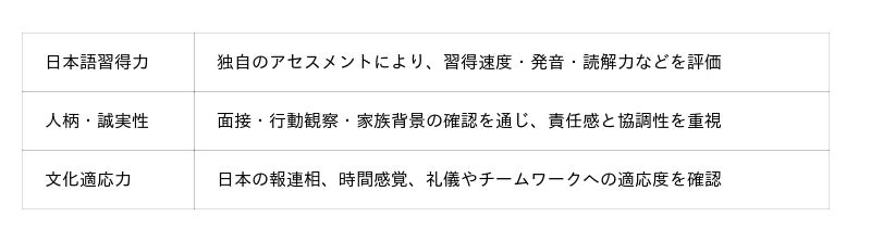 NAVIS HRでは、「日本で働きたい」という想いだけでは選考されません。“日本社会で信頼される人材”を育成するため、以下のような多段階かつ多角的な選抜・教育体制を構築しています:
