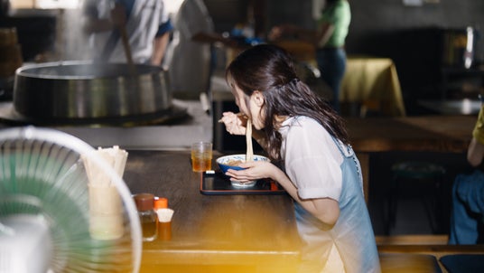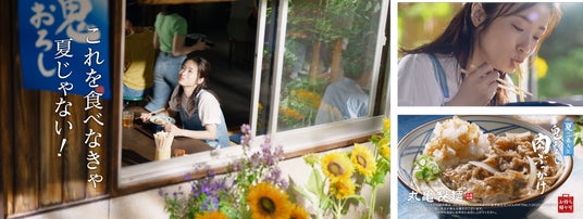 上戸さんは「ん~、夏はこれですよ!」というナレーションとともに、『鬼おろし肉ぶっかけうどん』を箸が止まらない様子で食べ進めます。そしてひまわりが咲く窓の外から見える、上戸さんの幸せそうな表情もまた、このうどんのおいしさを一層引き立てています。そして、最後に、『鬼おろし肉ぶっかけうどん』が画面いっぱいに映し出され、本TVCMを締めくくります。