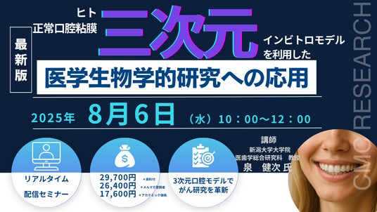 先端技術情報や市場情報を提供している(株)シーエムシー・リサーチ(千代田区神田錦町: https://cmcre.com/ )では、 各種材料・化学品などの市場動向・技術動向のセミナーや書籍発行を行っておりますが、 このたび「ヒト正常口腔粘膜3次元インビトロモデルを利用した医学生物学的研究への応用」と題するセミナーを、 講師に泉 健次 氏(新潟大学大学院 医歯学総合研究科 教授)をお迎えし、2025年8月6日(水)13:30より、 ZOOMを利用したライブ配信で開催いたします。 受講料は、 一般:29,700円(税込)、 弊社メルマガ会員:17,600円(税込)、 アカデミック価格は17,600円(税込)となっております(資料付)。