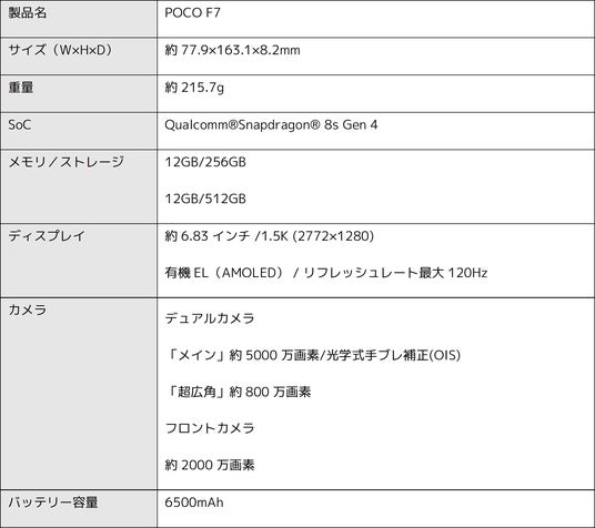 小米技術日本株式会社(以下「シャオミ・ジャパン」、本社:東京都港区)は、POCOのフラッグシップクラスのFシリーズから最新モデル「POCO F7」を本日7月8日(火)より発売します。市場想定価格は12GB/256GBが54,980円(税込)、12GB/512GBが64,980円(税込)です。さらに、本製品の発売を記念して、7月8日(火)09:00から7月14日(月)23:59までの期間限定で6000円オフの早割価格キャンペーンを実施します。