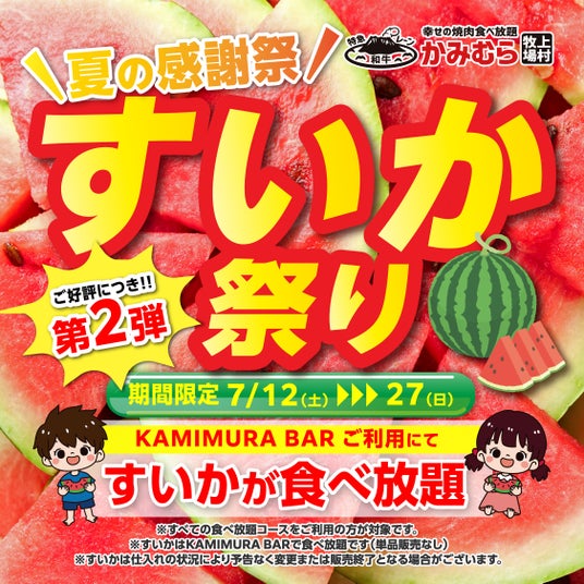 6月25日から7月3日まで実施した第1弾が大変ご好評をいただきましたことを受け、第2弾の開催を決定しました。「すいか祭り」は、すべての食べ放題コースやセットでKAMIMURA BARをご注文のお客様を対象に、KAMIMURA BAR*にて「すいか」を食べ放題でご提供する、夏ならではの感謝祭です。