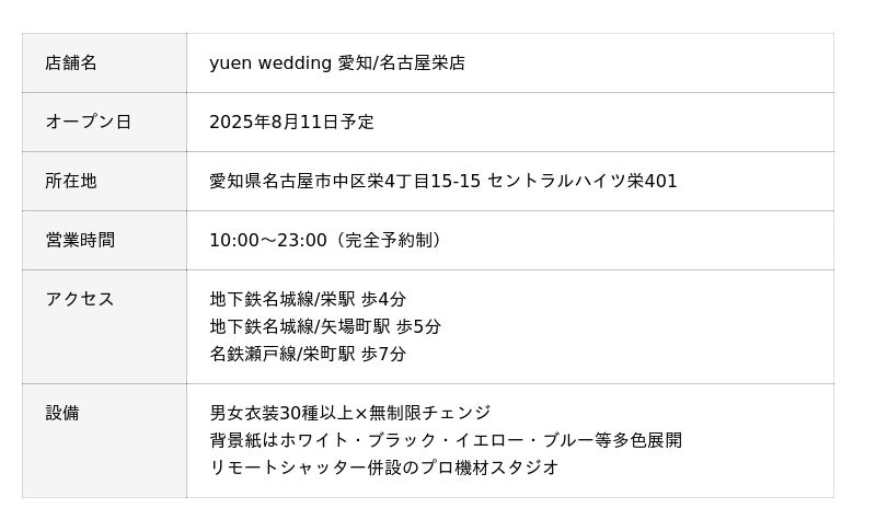 セルフフォトウェディングスタジオ「yuen wedding(ユエン・ウェディング)」を運営する合同会社yuen(本社:東京都/代表:福田拓実)は、2025年8月11日、愛知県名古屋市中区栄に「yuen wedding 愛知/名古屋栄店」をオープンいたします。