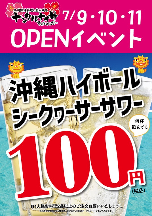 1.「沖縄ハイボール」と「シークヮーサーサワー」を何杯飲んでも1杯100円(税込)でご提供いたします。