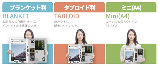 今回のリニューアルでは、従来のブランケット版(通常の新聞サイズ)、タブロイド判に加え、A4サイズの3つのサイズ展開をご用意。お客様の用途に合わせて柔軟にお選びいただけます。また、3つの印刷スタイルメニューを新たに導入いたしました。