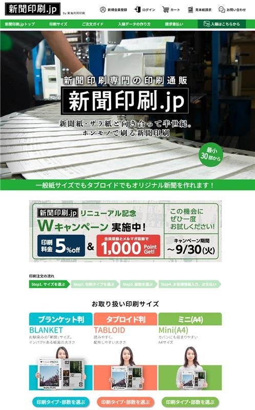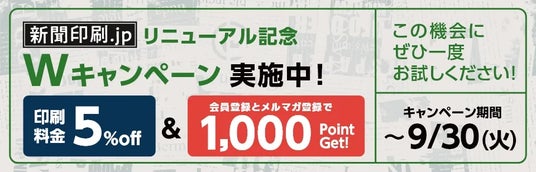 リニューアルを記念して、2025年9月30日まで「誰でも5%割引+新規会員登録とメルマガ購読で1,000ポイントゲット」キャンペーンを実施いたします。詳細は「新聞印刷.jp」キャンペーンサイト(https://www.shinbun-insatsu.jp/html/campaign/)にてご確認ください。この機会にぜひ、新しく生まれ変わった当サービスをご体験ください。