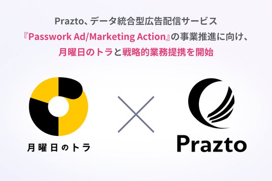 株式会社Prazto(本社:東京都千代田区、代表取締役:芳賀 怜史)は、データ統合型広告配信サービス『Passwork Ad/Marketing Action』の事業推進に向けて、マーケティング・テクノロジーに強みを持つ株式会社月曜日のトラ(本社:東京都目黒区、代表取締役:西 正広)と戦略的業務提携を開始いたします。