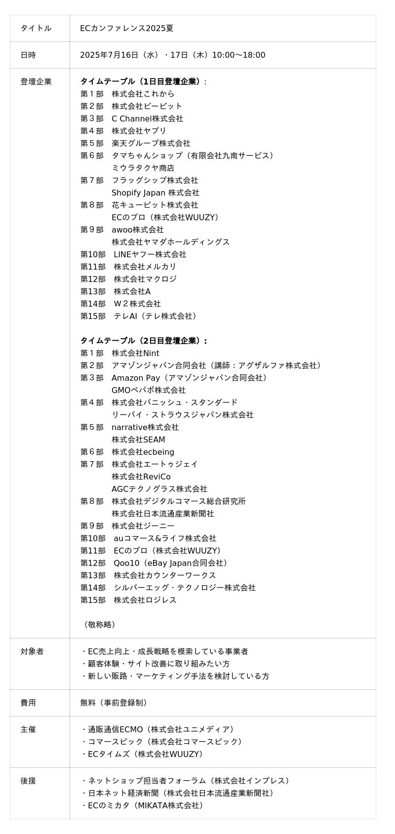 株式会社ユニメディア(本社:東京都千代田区、代表取締役社長:末田 真、以下「当社」)が運営する「通販通信ECMO」は、2025年7月16日(水)・17日(木)に「ECカンファレンス2025夏」をオンラインにて開催いたします。本セミナーは、「通販通信ECMO」、「ネットショップ担当者フォーラム」、「コマースピック」、「ECタイムズ」、「日本ネット経済新聞」、「ECのミカタ」など、EC通販メディアの協力による大規模なセミナーです。2日間にわたり、EC業界のトップリーダーによる貴重な知見を提供いたします。