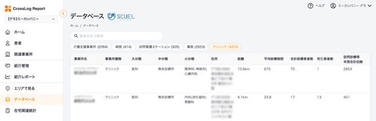 SCUELが保有する在宅患者数データ(訪問件数・平均診療期間・死亡数等)をCrossLog Reportに実装しました。地域内の他院と自院の実績を比較しながら、訪問エリアの戦略立案や診療効率の改善に活用できます。
