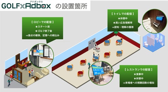 「アドボックス」とは、ゴルフ場をはじめとする商業施設内の個室空間に【無償で】デジタルサイネージを設置し、 来場者に向けて発信を行い最大限に情報を認知させることで、【ターゲット層へのダイレクトなアプローチ】を実現できる広告配信サービスです。