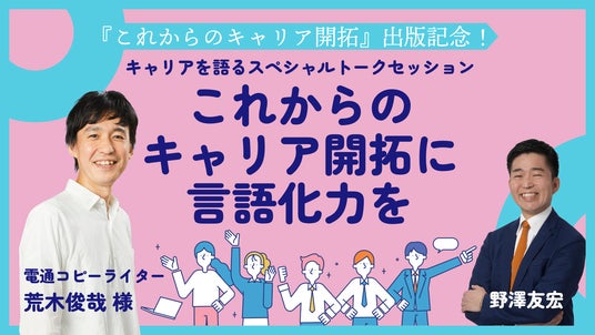 「部下との1on1がうまくいかない」「ミドルシニア社員がモチベーションを失っていく」などキャリアについて悩みは尽きません。そうした問題に共通する課題は、「言語化できていないこと」にあります。本セミナーでは、キャリアを考える上で大きなテーマでもある “思考の言語化” をわかりやすく教えてくれる書籍『瞬時に「言語化できる人」が、うまくいく。』『こうやって頭のなかを言語化する。』の著者であるコピーライターの荒木俊哉さんをお招きして、『これからのキャリア開拓』の著者NH代表野澤とセッションします。