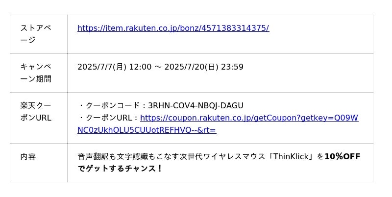 「ThinKlick」ヨドバシカメラ マルチメディア系列10店舗で店頭販売スタートを記念し、「BONZ楽天市場店」期間限定の割引キャンペーンを実施中。